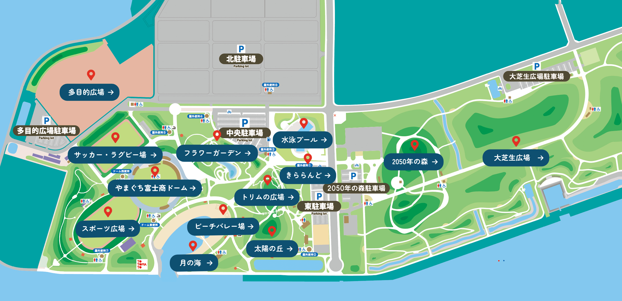 水や緑などの豊かな自然環境の中でスポーツを楽しむ人はもちろん、すべての人が「こころ」と「からだ」をリフレッシュできる開放的な空間として、県民の皆様にご利用いただけます。