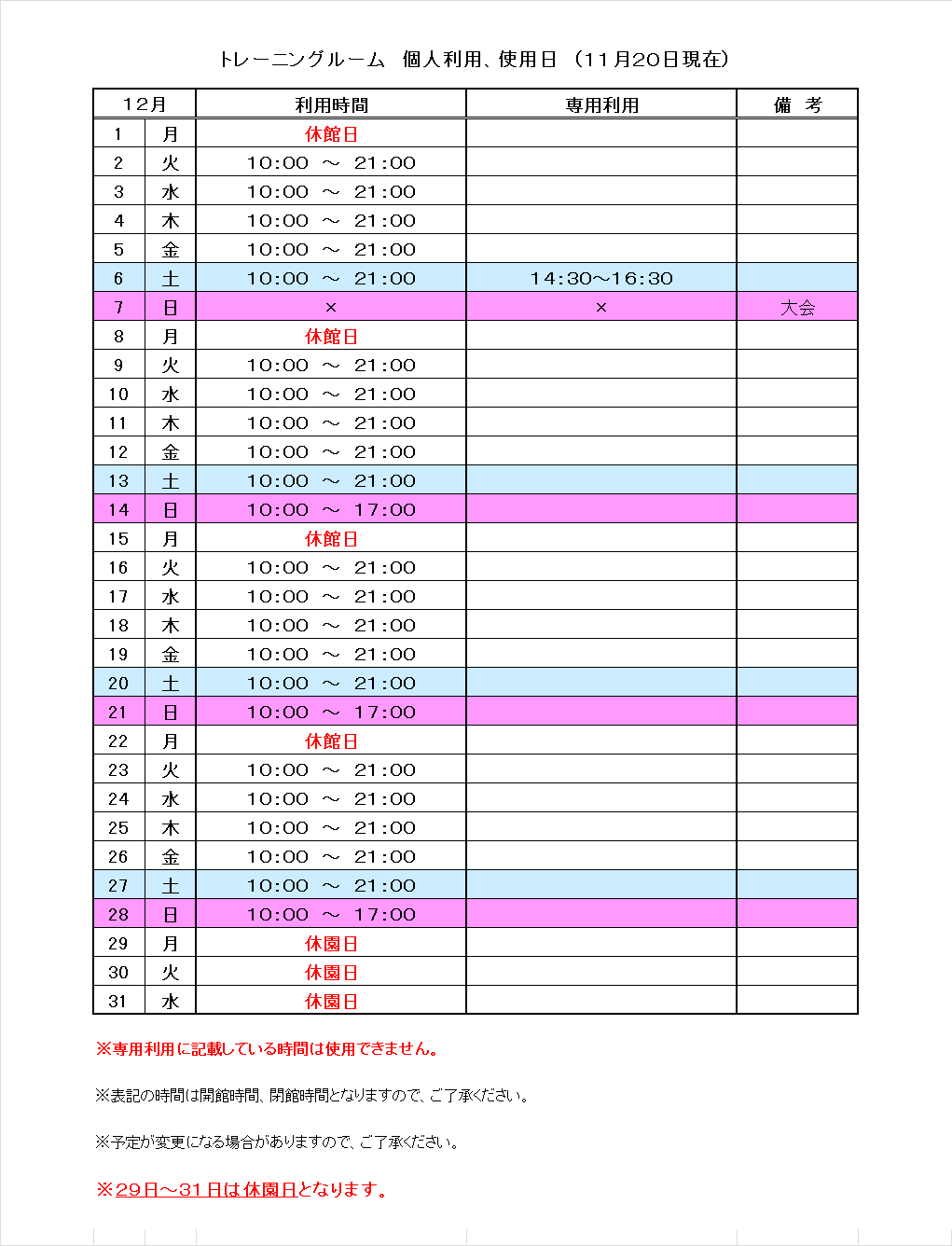 【水泳プール】一般開放カレンダー及びトレーニングルーム予定表(12月)