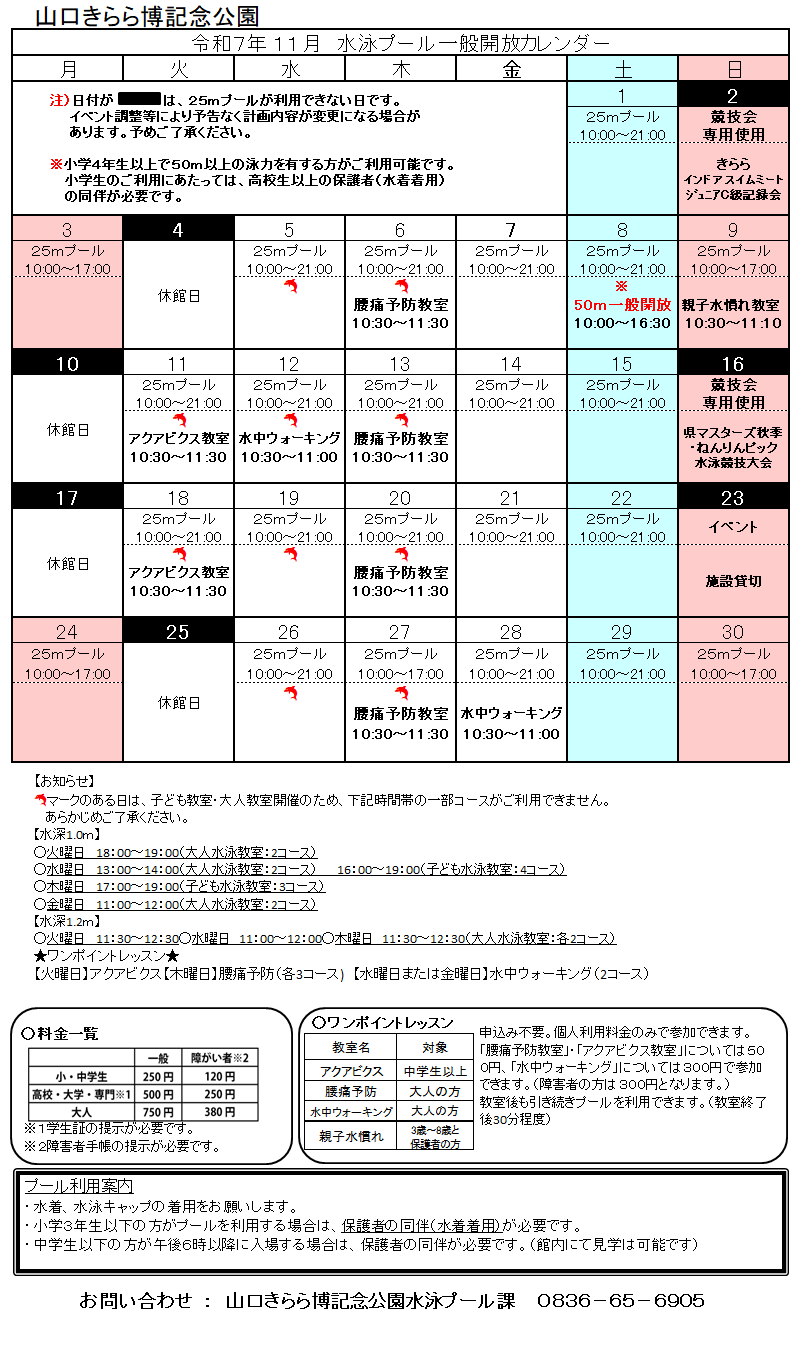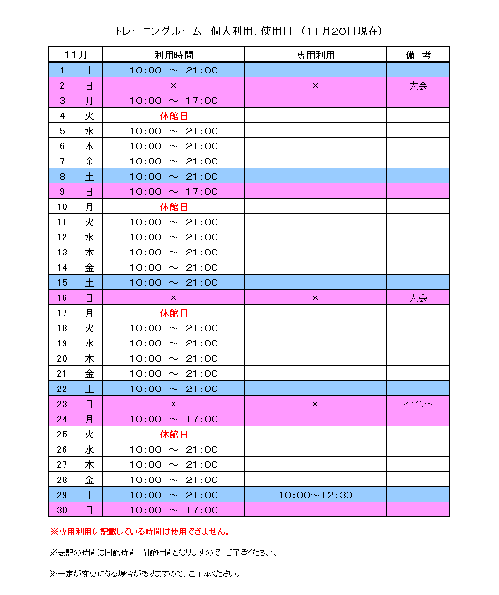 【水泳プール】一般開放カレンダー及びトレーニングルーム予定表(11月)