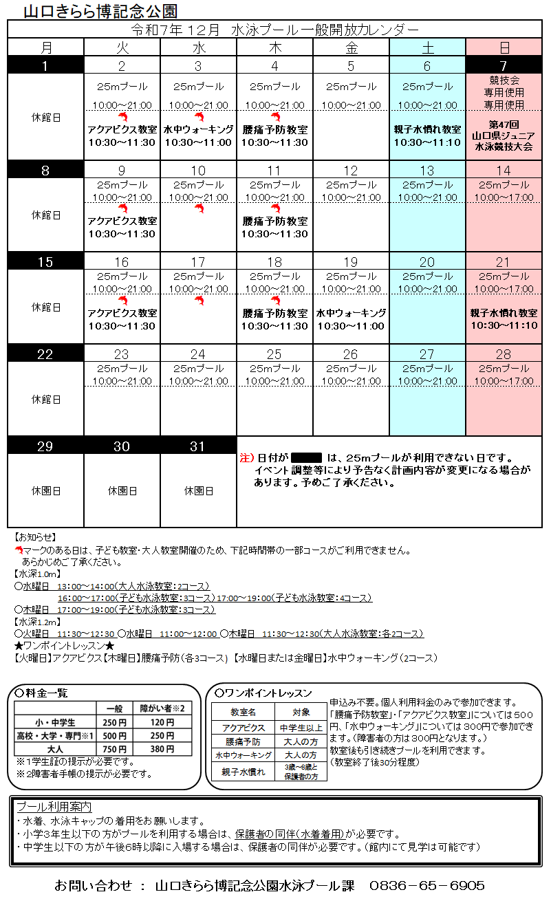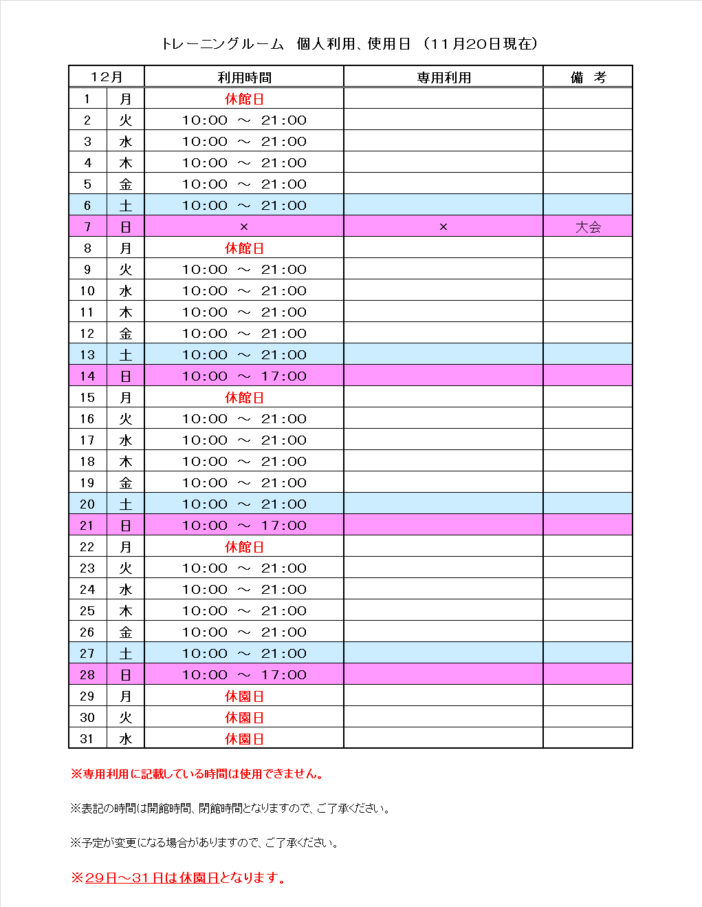 【水泳プール】一般開放カレンダー及びトレーニングルーム予定表(12月)