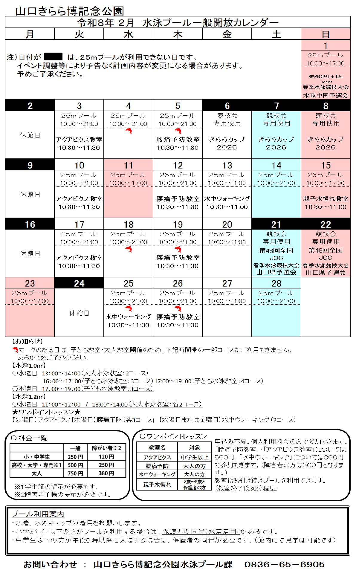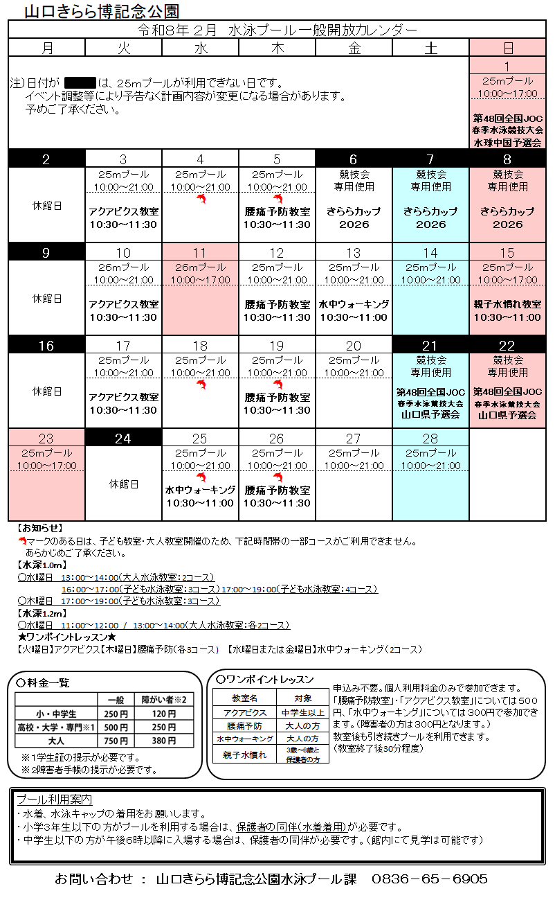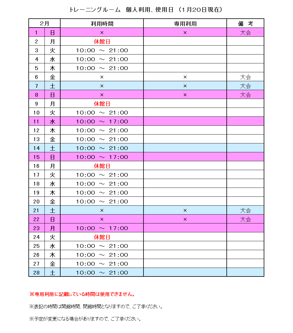 【水泳プール】一般開放カレンダー及びトレーニングルーム予定表(2月)