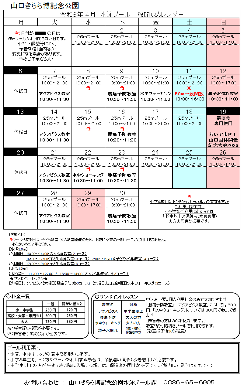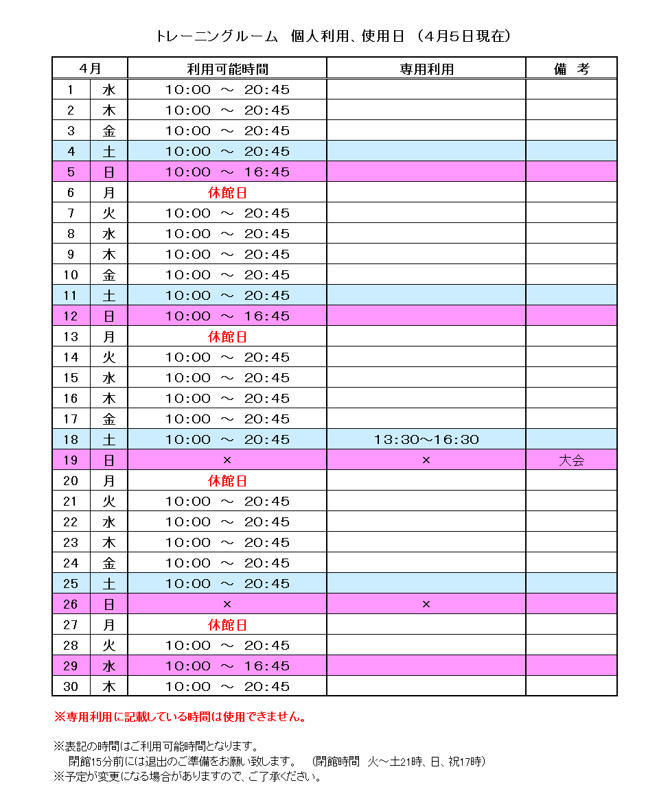 【水泳プール】一般開放カレンダー及びトレーニングルーム予定表(4月)